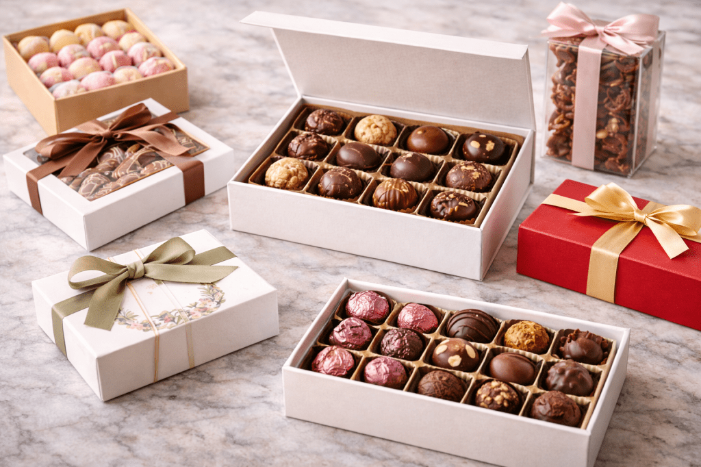 Branding also lives on candy boxes in powerful ways. Even something as simple as a sticker or custom-printed ribbon turns a plain box into a brand statement. Some shops choose bold colors; others choose minimal, clean designs. Window boxes show off decorated chocolates and add visual appeal. Two-piece boxes create a classic “gift opening” moment. There’s a style for every brand personality, and those choices shape how customers remember the shop.